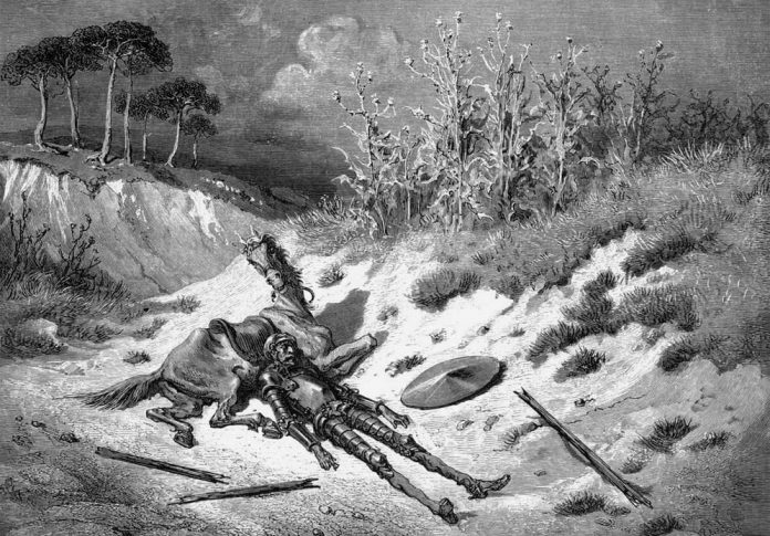 Y quiso la suerte que, cuando llegó a este verso, acertó a pasar por allí un labrador de su mesmo lugar y vecino suyo, que venía de llevar una carga de trigo al molino; el cual, viendo aquel hombre allí tendido, se llegó a él y le preguntó que quién era y qué mal sentía, que tan tristemente se quejaba. Don Quijote creyó sin duda que aquel era el marqués de Mantua, su tío, y, así, no le respondió otra cosa sino fue proseguir en su romance, donde le daba cuenta de su desgracia y de los amores del hijo del Emperante con su esposa, todo de la mesma manera que el romance lo canta.