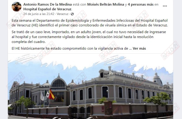 Por medio de una publicación en la red social Facebook, el pasado 24 de junio el galeno informó que «el Departamento de Epidemiología y Enfermedades Infecciosas del Hospital Español de Veracruz (HE) identificó el primer caso corroborado de viruela símica en el Estado de Veracruz».