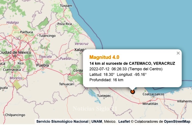 Fue a las 06:26 horas de este martes que el SSN registró el movimiento telúrico el cual alcanzó los 4.0 grados en magnitud Richter y tuvo su epicentro 14 kilómetros al Suroeste del municipio de Catemaco.