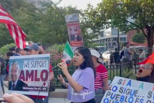 “We support AMLO”, indica otra de las pancartas que llamaban la atención de los medios presentes, que estaban a la espera de que el mandatario mexicano abandonara el hotel para acudir a su encuentro con Harris en la residencia de la VP.