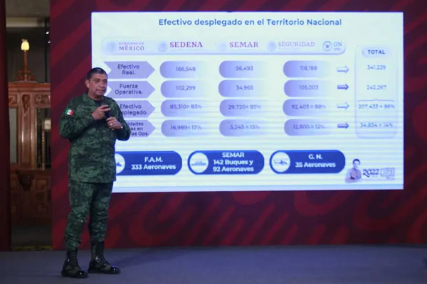 El secretario de la Defensa Nacional informó que el Ejército ha destruido 246 laboratorios de droga en lo que va del año, en los que se encontraron 950 kilos de metanfetaminas, 12 mil 820 litros de sustancias químicas, además de 111 condensadores.