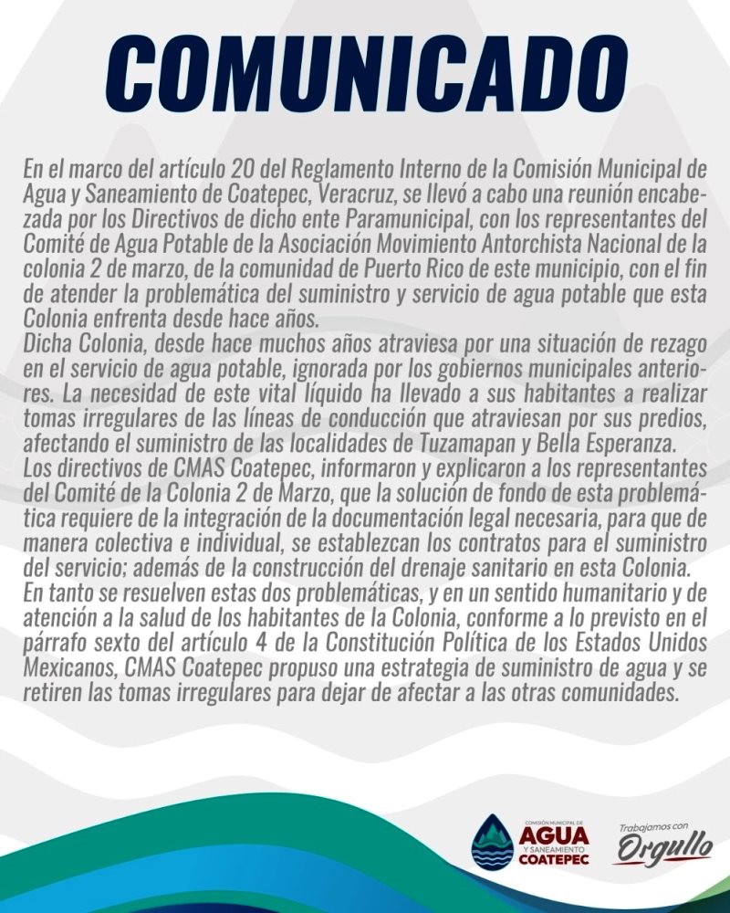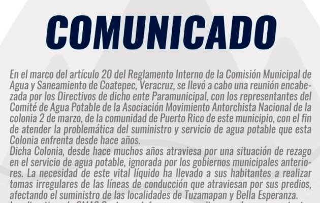 A través de un comunicado, el organismo refirió que la necesidad de dicha colonia, ha orillado a los habitantes a realizar tomas irregulares de las líneas de conducción que atraviesan por sus predios, lo que ha afectado el suministro de las localidades de Tuzamapan y Bella Esperanza.