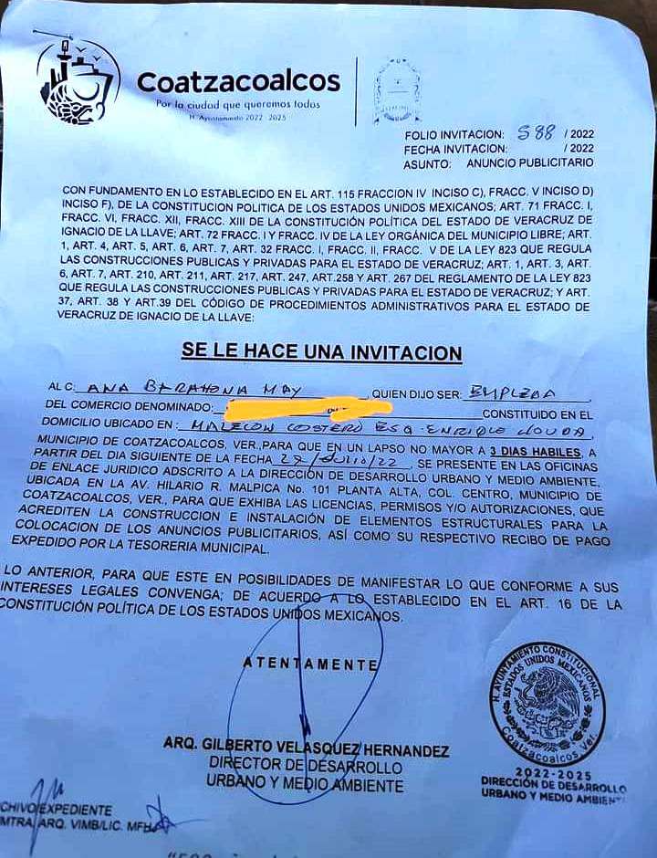 Y es que en fechas recientes, distintos negocios en Coatzacoalcos recibieron un citatorio por parte de la autoridad municipal para «que exhiba las licencias, permisos o autorizaciones que acredite la construcción e instalación de elementos estructurales para la colocación de anuncios publicitarios».