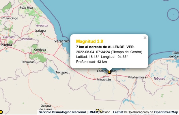 Fue a las 07:34 horas de este jueves que el SSN registró el movimiento telúrico el cual alcanzó los 3.9 grados de magnitud y tuvo su epicentro 7 kilómetros al Noreste de la localidad Allende del municipio de Coatzacoalcos.