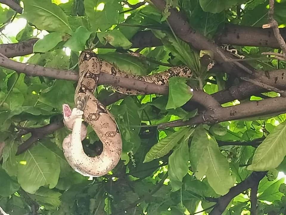 DestacadoGeneralVeracruz Impresionante serpiente aparece en el árbol de una casa en Veracruz, se comió dos palomas Por Redacc1 - agosto 15, 2022 0 171 Compartir en Facebook Compartir en Twitter Los hechos se registraron en la colonia Manuel Contreras en Veracruz. Testigos comentaron que la Boa Constrictor se comió dos palomas que estaban en un árbol de Almendros, este tipo de serpientes no son venenosas 1 of 2