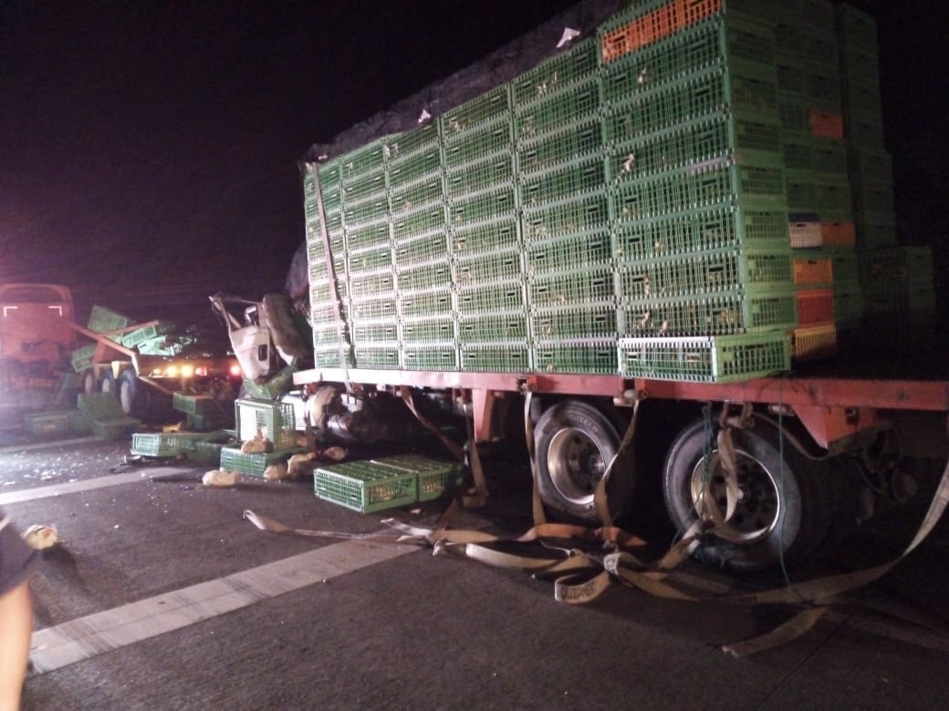 Los hechos se registraron alrededor de las 23:00 horas, al momento en que conductor del camión de transporte de rejas con pollos, no guardó su distancia correspondiente y se impctó contra la parte trasera del camión tipo caja.