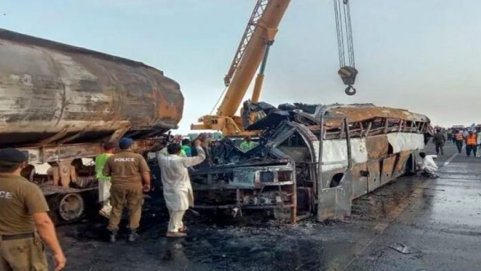 El comisionado de la administración de Multan, Amir Khattak, se trasladó al lugar del accidente, y más tarde informó en Twitter que el autobús que se dirigía desde la norteña ciudad de Lahore hasta la meridional Karachi golpeó por detrás al camión cisterna “desencadenando un incendio”, que causó 20 muertos y seis heridos.