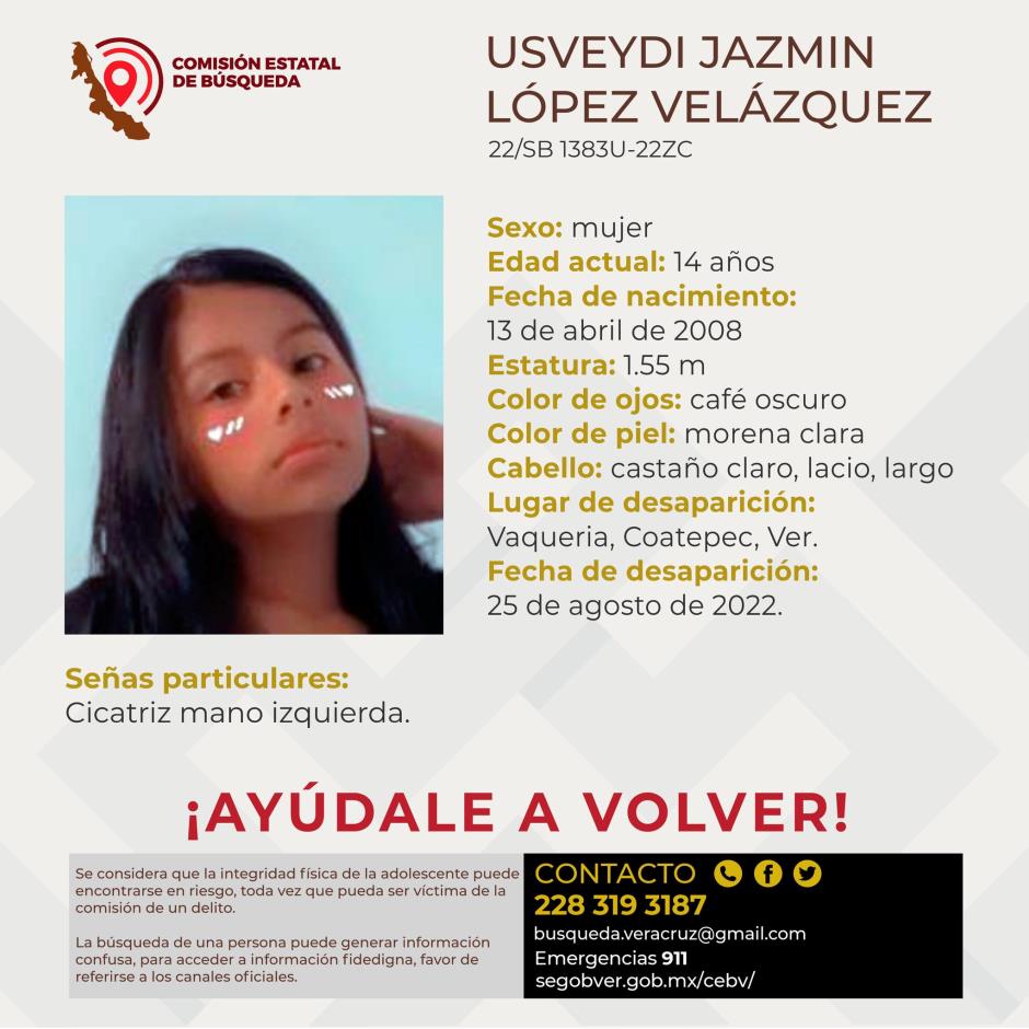 Cualquier informe sobre su paradero se puede realizar al teléfono 2283 193187 de la Comisión Estatal de Búsqueda.