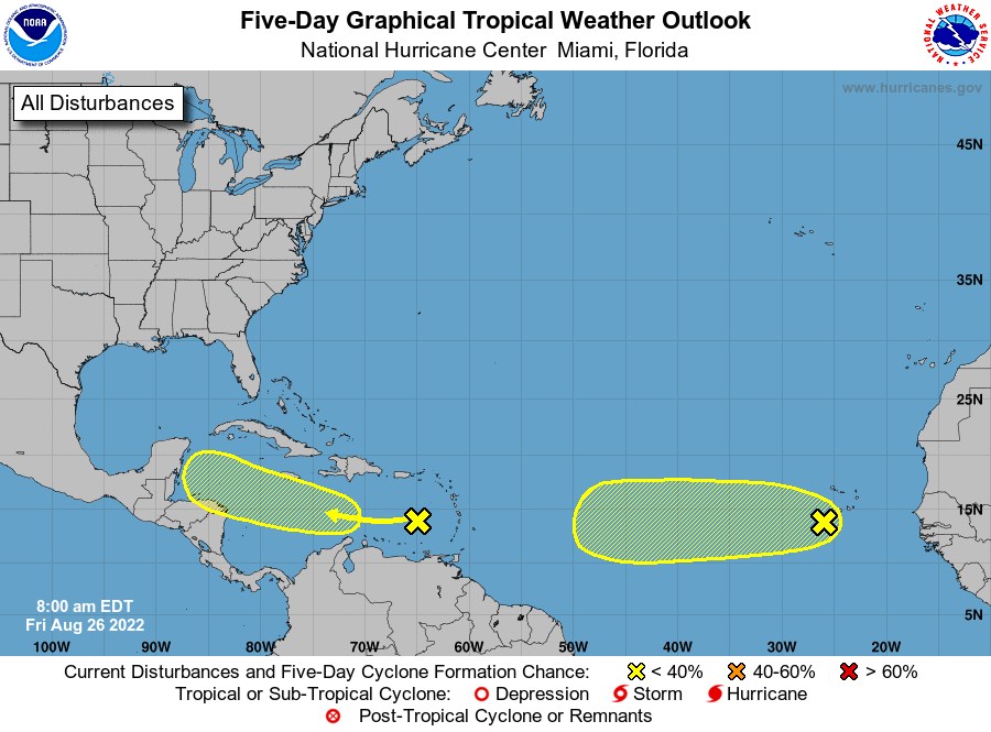 Se estima que este sistema se mueva hacia el oeste a unos 15 mph durante los próximos días y las condiciones ambientales podrían llegar a ser más propicias para el lento desarrollo a principios de la próxima semana cuando se mueva dentro del mar Caribe occidental.