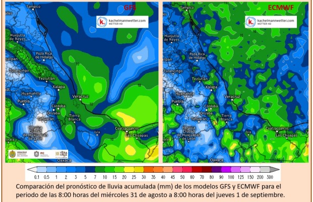 Viernes 2: lluvias con acumulados de 5 a 20 mm de forma general en la entidad con máximos de 70 a 100 mm de la cuenca de La Antigua al Tonalá y de 20 a 50 mm en el resto del estado