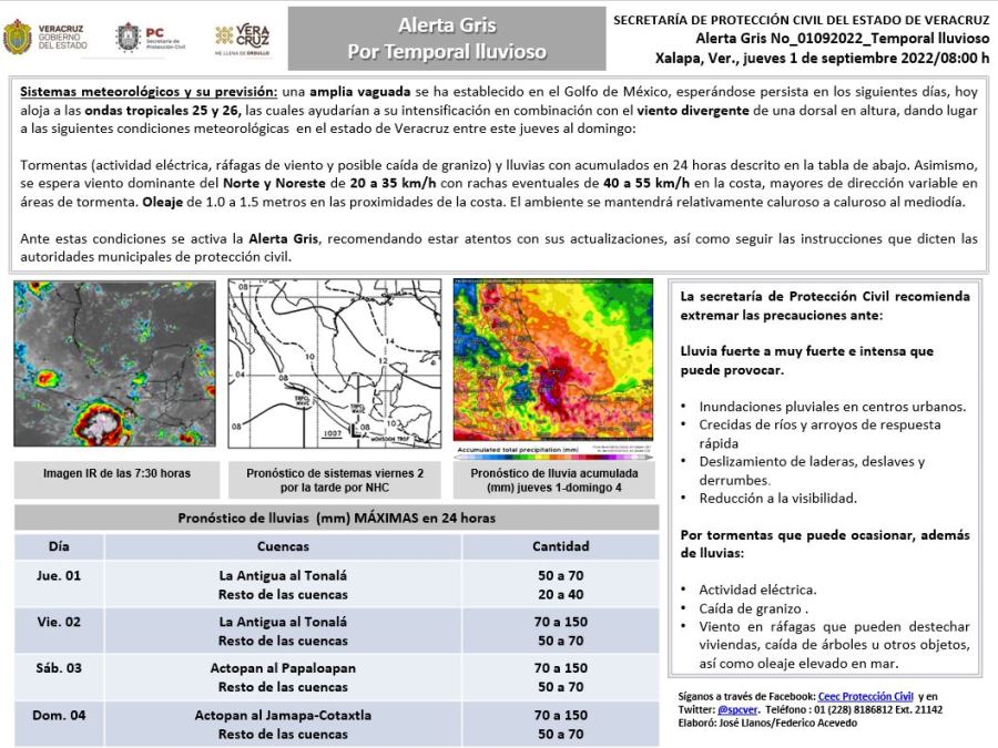 Sistemas meteorológicos y su previsión: una amplia vaguada se ha establecido en el Golfo de México, esperándose persista en los siguientes días, hoy aloja a las ondas tropicales 25 y 26, las cuales ayudarían a su intensificación en combinación con el viento divergente de una dorsal en altura, dando lugar a las siguientes condiciones meteorológicas en el estado de Veracruz entre este jueves al domingo: