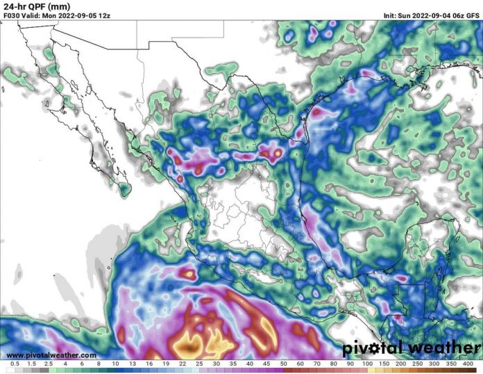 En las próximas 24 horas se espera que la probabilidad de lluvias y tormentas esté presenta en gran parte del país, con los valores más bajos o nulos en amplios sectores del noroeste, norte, centro, y sureste, mientras que los máximos acumulados se prevén en el sur de Chihuahua, Coahuila, Durango, Nuevo León, Tamaulipas, oeste de Jalisco, Colima, Michoacán, Guerrero, Oaxaca, Chiapas, suroeste del Estado de México, Ciudad de México, Morelos, sureste de San Luis Potosí, Puebla, Hidalgo, Veracruz, Tabasco y Campeche. Por otra parte, se espera poco cambio o ligera disminución de la temperatura máxima en la mayor parte del territorio nacional, registrándose los valores más altos en la península de Baja California, Sonora, Sinaloa, Tamaulipas, centro de Michoacán, y sectores de la Península de Yucatán. Mientras tanto, las temperaturas mínimas más bajas seguirán en estados del norte y centro del país, así como en montañas del territorio nacional. En el noreste de Baja California y noroeste de Sonora, se espera aumente la intensidad del calor al amanecer. En el litoral del Golfo de México y mar Caribe se espera viento del Sureste Este, Noreste y Norte de 20 a 35 km/h con rachas de 35 a 45 km/h principalmente en costas de Veracruz y Sonda de Campeche. En el litoral del Pacífico Mexicano se prevé viento del Noroeste, Oeste, Suroeste, Sur y Sureste de 20 a 35 km/h con rachas de 35 a 45 km/h, excepto en Michoacán y Guerrero que será del Este, Sureste y Sur de 35 a 50 km/h con rachas de 55 a 70 km/h.