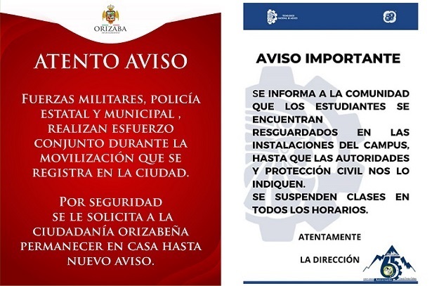 Por su parte, el Ayuntamiento de Orizaba emitió un comunicado pidiendo a la ciudadanía «Permanecer en su casa hasta nuevo aviso», por los operativos conjuntos que se encontraban realizando Fuerzas Militares y Policía Estatal y Municipal.