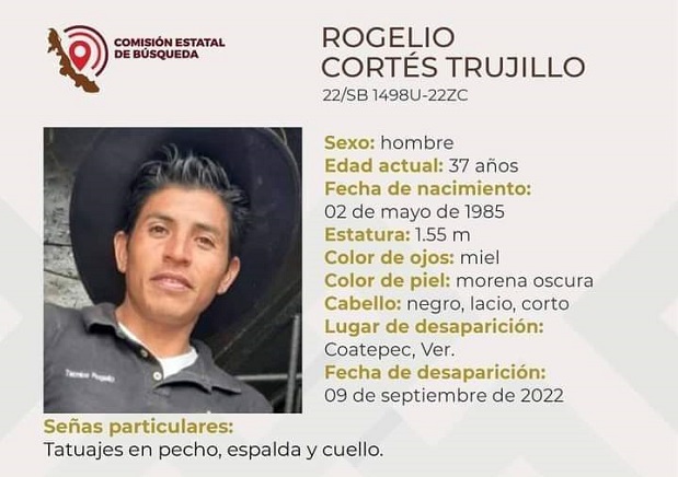 Se trata del señor Rogelio Cortés Trujillo, de 37 años, quien mide 1.55 metros de estatura, tiene piel color morena clara, cabello negro lacio y corto así como ojos color miel.