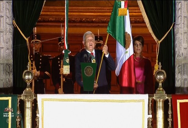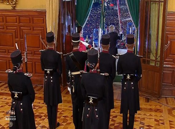 Luego de recibir el lábaro Patrio en el interior del Palacio Nacional, por parte de la escolta conformada por Cadetes del Heroico Colegio Militar, el presidente López Obrador, salió al balcón principal para dar el grito:
