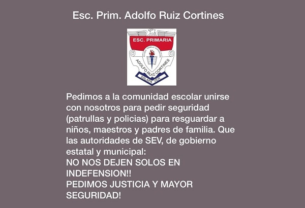 Xalapa, Ver. (Sandy Barradas).- Padres de familia de la Escuela Primaria “Adolfo Ruiz Cortines” ubicada en la ciudad de Xalapa, exigen a las autoridades de la Secretaría de Educación (SEV) así como al Gobierno Estatal y Municipal, seguridad afuera de la institución, luego del asesinato de una docente.