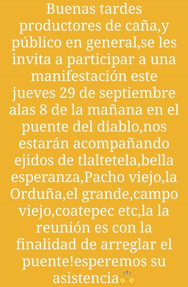 «Buenas tardes, productores de caña y publico en general, se les invita a participar a una manifestación este jueves 29 de septiembre a las 8 de la mañana en el puente del diablo, nos estarán acompañando ejidos de tlaltetela, bella esperanza, Pacho viejo, la Orduña, el grande, campo viejo, coatepec etc, la reunión es con la finalidad de arreglar el puente! esperemos sus asistencia»