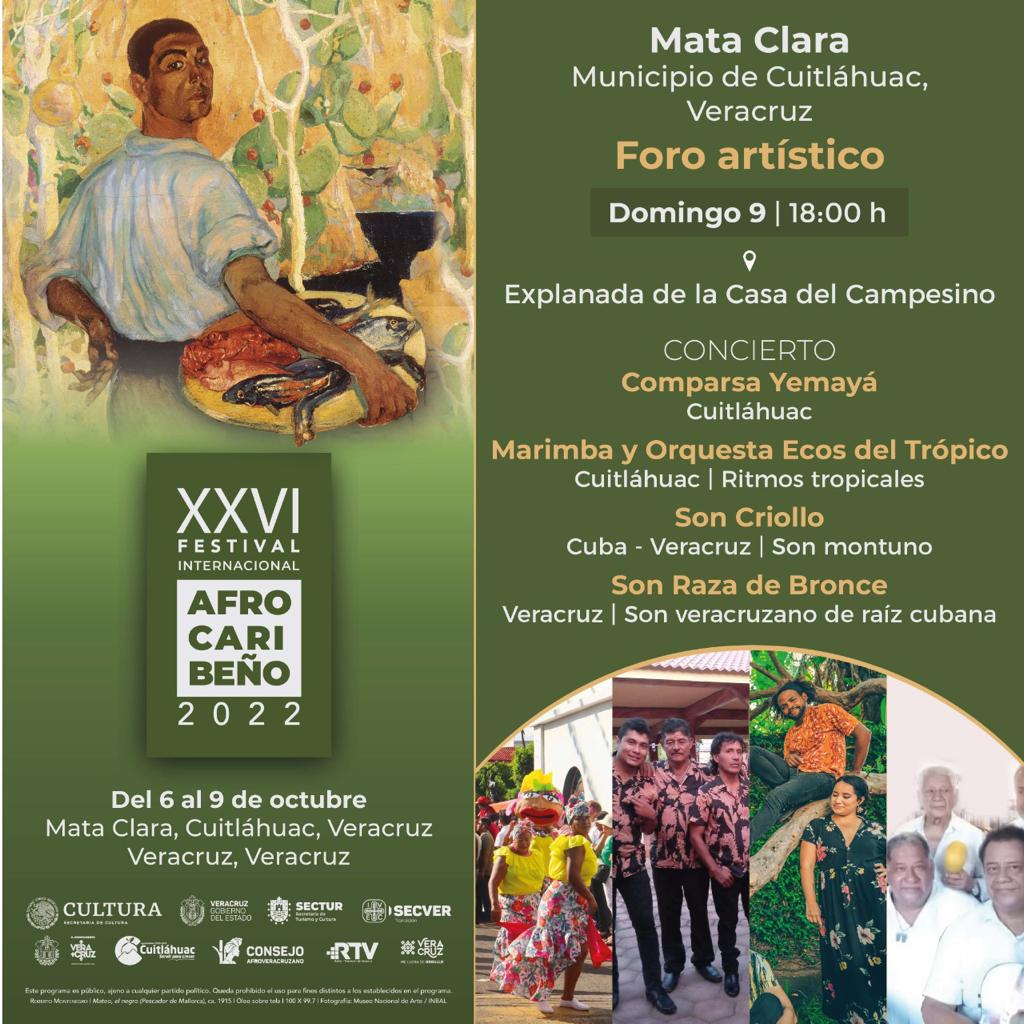 Xalapa, Ver.- Con la gastronomía afrodescendiente como eje temático, la población podrá disfrutar de las actividades artísticas y académicas del XXVI Festival Internacional Afrocaribeño realizado por el Instituto Veracruzano de la Cultura en la comunidad de Mata Clara, municipio de Cuitláhuac, los próximos sábado 08 y domingo 09 de octubre en la explanada de la Casa del Campesino.