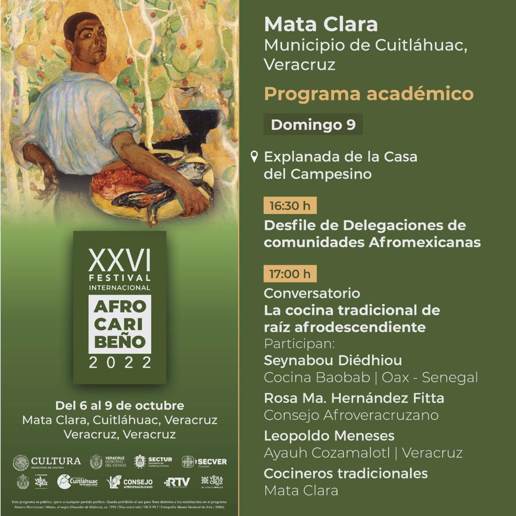 El domingo 09, a las 16:30 horas, el público está invitado al desfile de delegaciones de comunidades afromexicanas; mientras que en punto de las 17:00 horas tendrá lugar el conversatorio La cocina tradicional de raíz afrodescendiente, diálogo con la participación de la colaboradora del Consejo Nacional para Prevenir la Discriminación y de la Comisión Nacional de los Derechos Humanos, Gina Diédhiou; la representante del Consejo Afroveracruzano, Rosa María Hernández Fitta; y el director del Centro Cultural Ayauh Cozamalotl, Leopoldo Meneses.