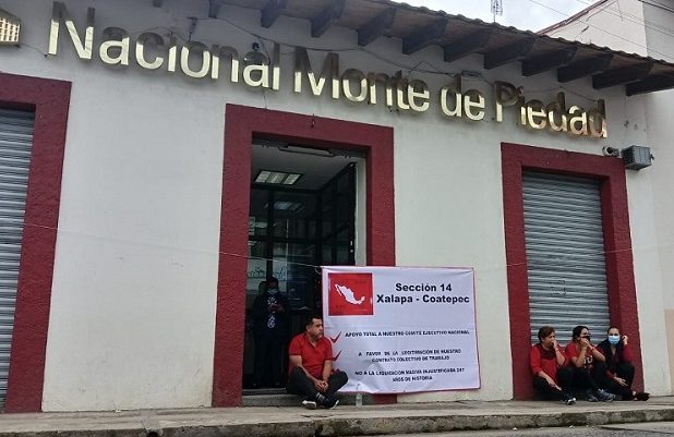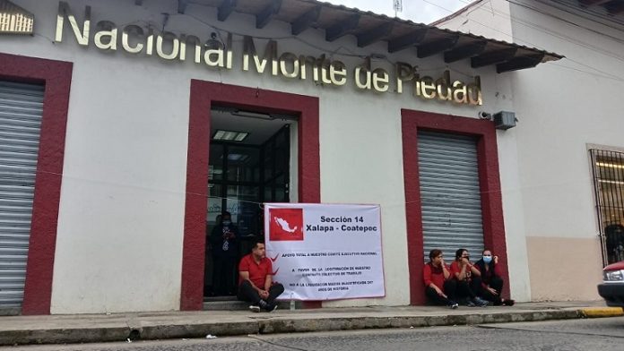 Coatepec, Ver. (SANDY BARRADAS).- Trabajadores del Monte de Piedad se manifestaron en la sucursal de Coatepec ante la inconformidad de una posible afectación en sus condiciones laborales.