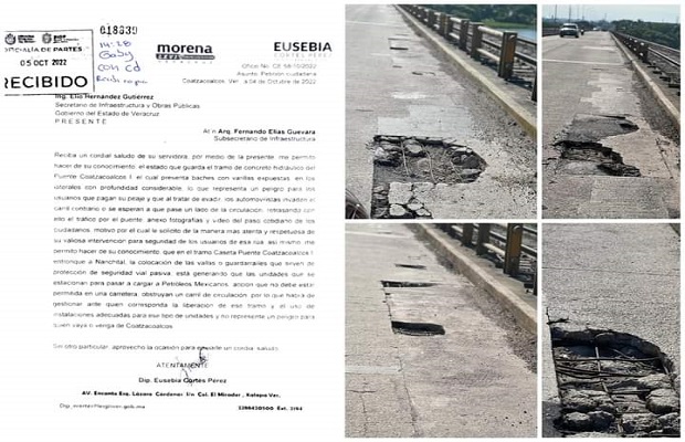 XALAPA, VER.- La diputada local de MORENA, Eusebia Cortés Pérez, exigió a la Secretaria de Infraestructura y Obras Públicas que encabeza Elio Hernández Gutiérrez, la reparación del tramo de concreto hidráulico del Puente Coatzacoalcos 1.