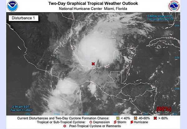 El Centro Nacional de Huracanes con sede en Florida, ha elevado la probabilidad de desarrollo a Ciclón Tropical a 80%, del disturbio 93L, centrado en el Golfo de México al norte de Tabasco. Un avión de reconocimiento está en ruta para investigarlo.