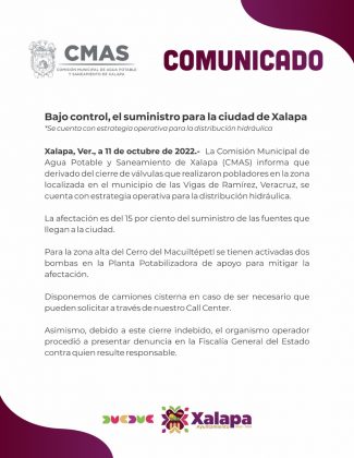 “Derivado del cierre de válvulas que realizaron pobladores en la zona localizada en el municipio de las Vigas de Ramírez, Veracruz, se cuenta con estrategia operativa para la distribución hidráulica”.