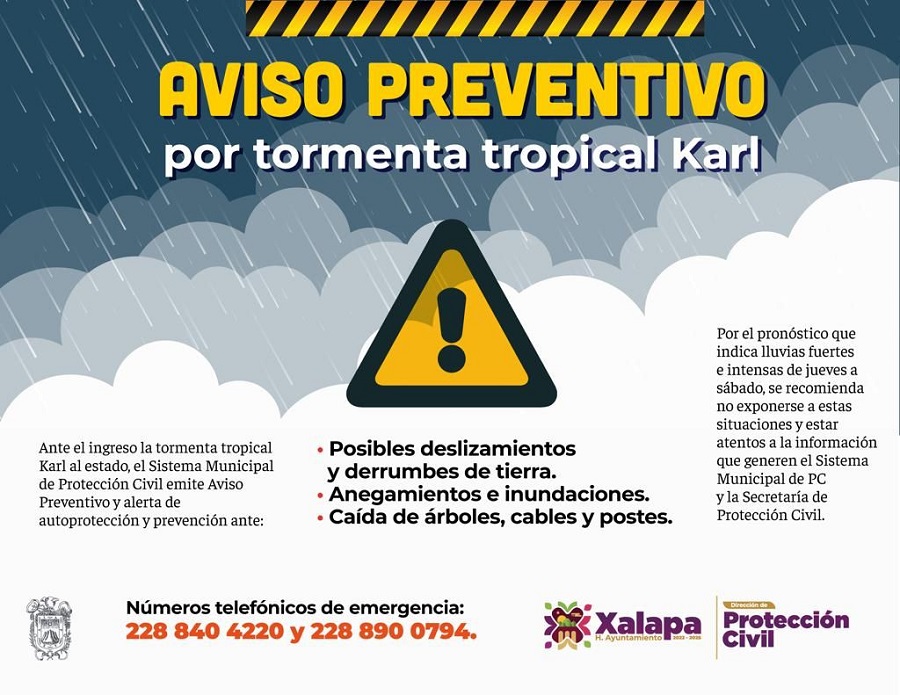 Xalapa, Ver.- Ante el ingreso la tormenta tropical Karl al estado, el Sistema Municipal de Protección Civil emitió un Aviso Preventivo y alerta de autoprotección y prevención, ya que se esperan lluvias de fuertes a intensas de jueves a sábado, informó el director de Protección Civil, Luis Sardiña Salgado.