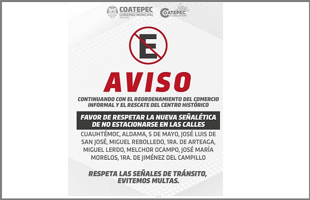 Y es que la autoridad municipal informó que queda prohibido estacionarse en las calles Cuauhtémoc, Aldama, 5 de mayo, José Luis de San José, Miguel Rebolledo, 1era de Arteaga, Miguel Lerdo, Melchor Ocampo, José María Morelos y 1era de Jiménez del Campillo.