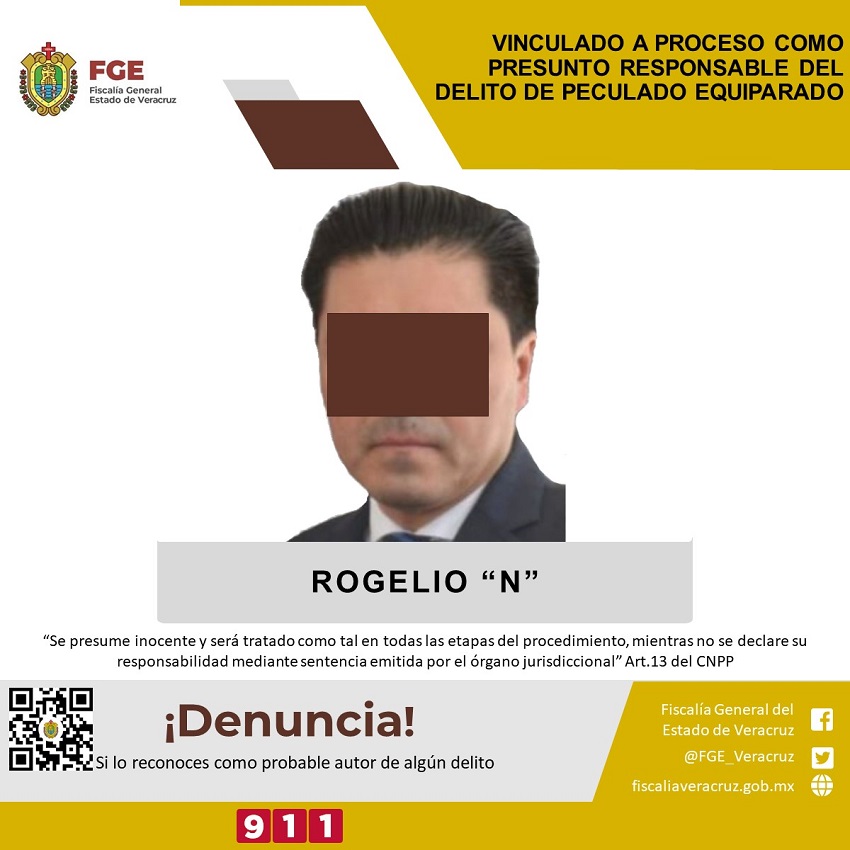 Xalapa, Ver.- La Fiscalía General del Estado, dio a conocer que obtuvo vinculación a proceso en contra de Rogelio “N”, como presunto responsable del delito de peculado equiparado en agravio de la Secretaría de Gobierno del Estado de Veracruz, hechos asentados dentro del Proceso Penal 312/2021.