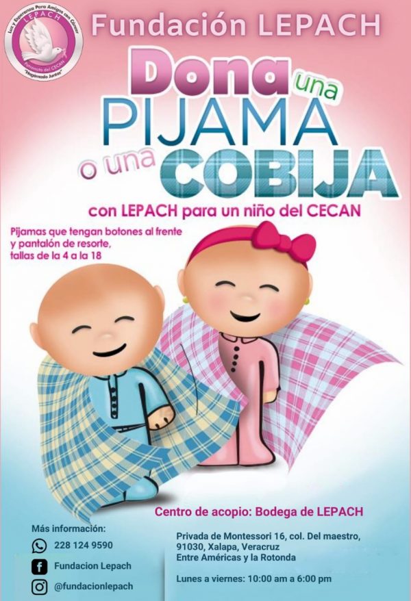 Xalapa, Ver.- (Enrique Yasser Pompeyo) Con la finalidad de participar en la campaña para donar cobijas y pijamas para menores del Centro Estatal de Cancerología «Dr. Miguel Dorantes Mesa» durante esta temporada invernal, la asociación civil «Luz y Esperanza Para Amigos con Cáncer Hagámoslo Juntos», (LEPACH) convocó a la población.