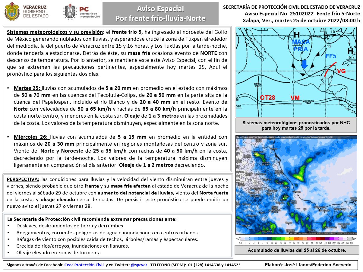 Las precipitaciones más importantes se pueden registrar entre las cuencas de los ríos Tecolutla al Colipa y parte alta de la cuenca del Papaloapan. Asimismo, se prevé un evento de Norte con velocidades de 50 a 60 km/h con rachas de 65 a 80 km/h principalmente en las costas norte y centro.