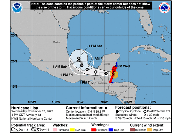 De acuerdo con el pronóstico oficial de las 03 horas de hoy del Centro Nacional de Huracanes, se espera Lisa impacte esta tarde en Belice, cruce este país, el norte de Guatemala y Tabasco, entre la noche de hoy y mañana jueves 3, e ingrese como una depresión tropical al suroeste del Golfo de México el viernes 4, donde puede merodear durante el fin de semana, cuando también se prevé ingrese al Noroeste del mismo golfo un frente frío.