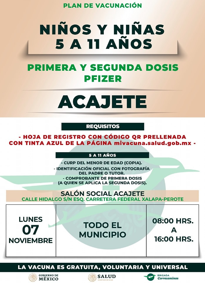 En el municipio de Acajete, será en el Salón Social de Acajete, ubicado a un costado de la carretera federal, donde desde las ocho de la mañana se iniciará la aplicación del biológico a los menores de edad.