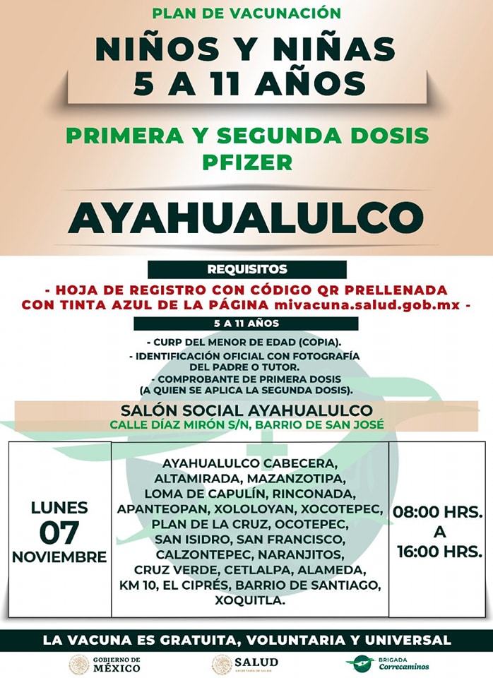 Coatepec, Ver.- A partir de las ocho horas de este lunes 7 de noviembre, se aplicará la dosis contra el Covid-19 a niñas y niños 5 a 11 años en los municipios de Acajete y Ayahualulco, informó la Delegación de Programas del Bienestar en este municipio.