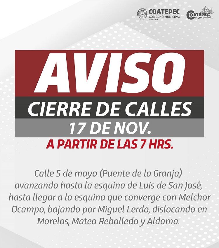 De acuerdo a un comunicado del Ayuntamiento de Coatepec, serán las calles de 5 de mayo (puente de la Granja) de la esquina de Luis de San José hasta la esquina de Melchor Ocampo por Miguel Lerdo, dislocando en Morelos, Mateo Rebolledo y Aldama.