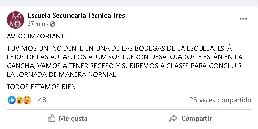 TUVIMOS UN INCIDENTE EN UNA DE LAS BODEGAS DE LA ESCUELA, ESTÁ LEJOS DE LAS AULAS, LOS ALUMNOS FUERON DESALOJADOS Y ESTÁN EN LA CANCHA, VAMOS A TENER RECESO Y SUBIREMOS A CLASES PARA CONCLUIR LA JORNADA DE MANERA NORMAL.