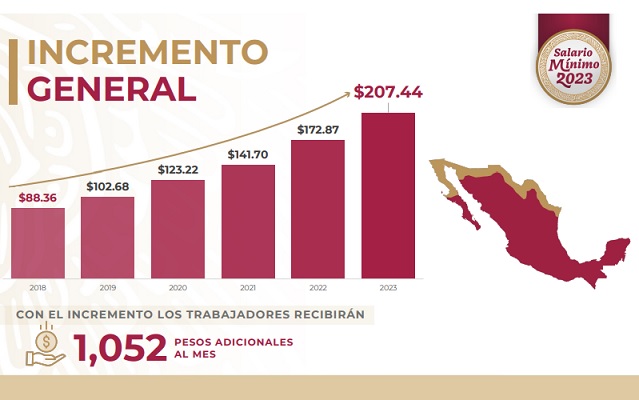 La Comisión Nacional de Salarios Mínimos confirmó que los salarios mínimos en México tendrán un incremento de 20% para el año 2023; los mínimos generales pasarán de 172.87 a 207.44 pesos diarios; mientras que en la Zona de la Frontera Norte el salario mínimo pasará de 260.34 a 312.41 pesos diarios.