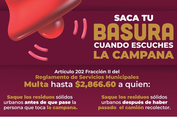 De acuerdo con el Reglamento de Servicios Municipales, se podría multar hasta con 2 mil 866 pesos a quien saque sus residuos a la vía pública antes del toque de campana o después de que haya pasado el camión recolector.