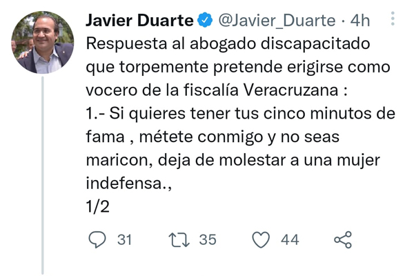A través de sus redes sociales, el exmandatario veracruzano precisó que «si quieres tener tus cinco minutos de fama , métete conmigo y no seas maricon, deja de molestar a una mujer indefensa.»