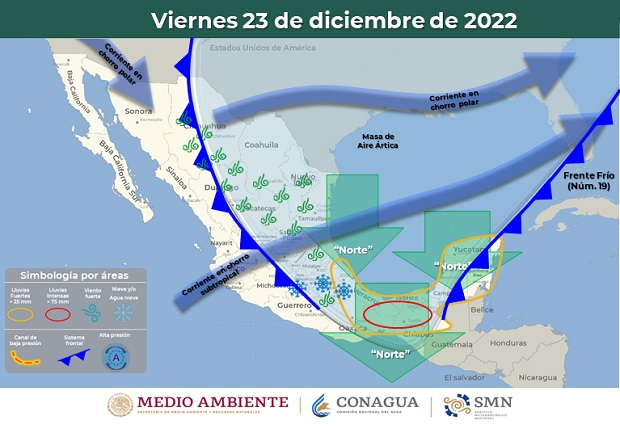 Avanza hacia el sur y sureste impulsado por una potente masa de aire ártico, esperándose ingresen al noroeste del Golfo de México esta tarde, y ambos recorran Tamaulipas y Veracruz durante la misma tarde y noche de hoy, y mañana viernes 23, ocasionando condiciones invernales adversas, como son lluvias fuertes, evento de NORTE intenso, oleaje elevado y marcado descenso de temperatura. Ante esta situación, las acciones preventivas para enfrentar los efectos negativos deben estar concluidas por parte de autoridades y población.