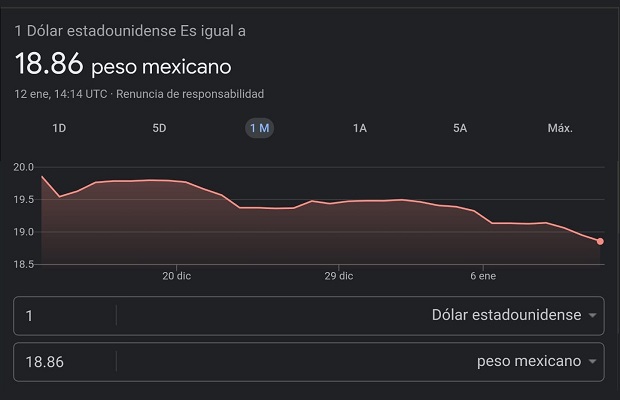 DestacadoEconomíaNacional Sigue bajando el dólar de EEUU, hoy está en 18.86 pesos Por Redacc1 - enero 12, 2023 0 134 Compartir en Facebook Compartir en Twitter Luego que este miércoles el dolar se cotizara en 18.97 pesos por unidad, por lo que la moneda mexicana rompió la barrera de los 19 pesos; ahora, este jueves 12 el precio del dólar se ubica al inicio de la jornada en 18.86 pesos mexicanos.