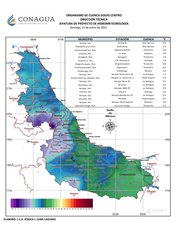 Sobre las temperaturas mínimas, indicó que la localidad de Zalayeta en Perote registró -9 grados, la comunidad de La Joya en Acajete -2 grados y Huatusco -1 grado.