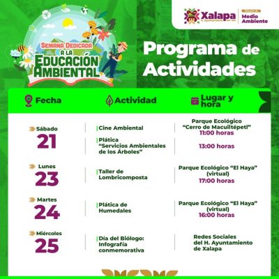 Xalapa, Ver.- En el marco del Día Mundial de la Educación Ambiental, la Dirección de Medio Ambiente preparó distintas actividades a realizarse del 21 al 28 de enero en los parques ecológicos El Haya y Macuiltépetl, además de otros puntos de la ciudad.