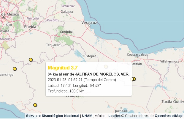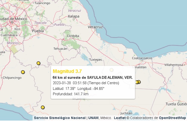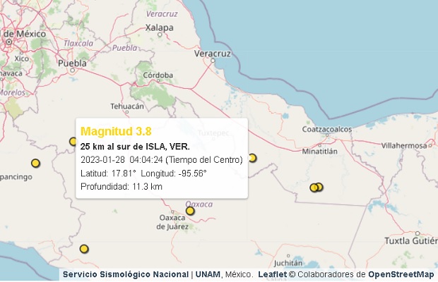 El tercer y último sismo de esta madrugada registrado por el SSN fue a las 04:04 a 25 kilómetros al Sur de Isla, con una magnitud de 3.8, con su epicentro geolocalizado en Latitud: 17.81°  Longitud: -95.56° y a una profundidad: 11.3 km.