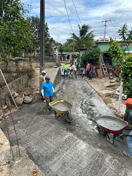 Con pala en mano, acarreando bultos y vertiendo cemento en un camino de 200 metros lineales de pavimento, solicitado por las familias de esta localidad, Juan Javier Gómez Cazarín expresó que donde la población se organice, ahí se estará apoyando para la realización de las obras que requieran.