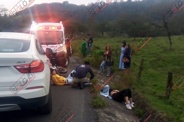 Xico, Ver.- Dos jóvenes resultaron con heridas de consideración al chocar la moto en que viajaban contra un auto en la carretera hacia Xico Viejo esta tarde.