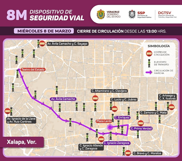 Xalapa, Ver.- Con motivo de la Marcha del #8M que se espera lleve a cabo un grupo de mujeres, la Dirección de Tránsito del Estado ha informado que este miércoles, desde la 1 de la tarde, se mantendrán cerradas vialidades en la zona centro de la capital del Estado.