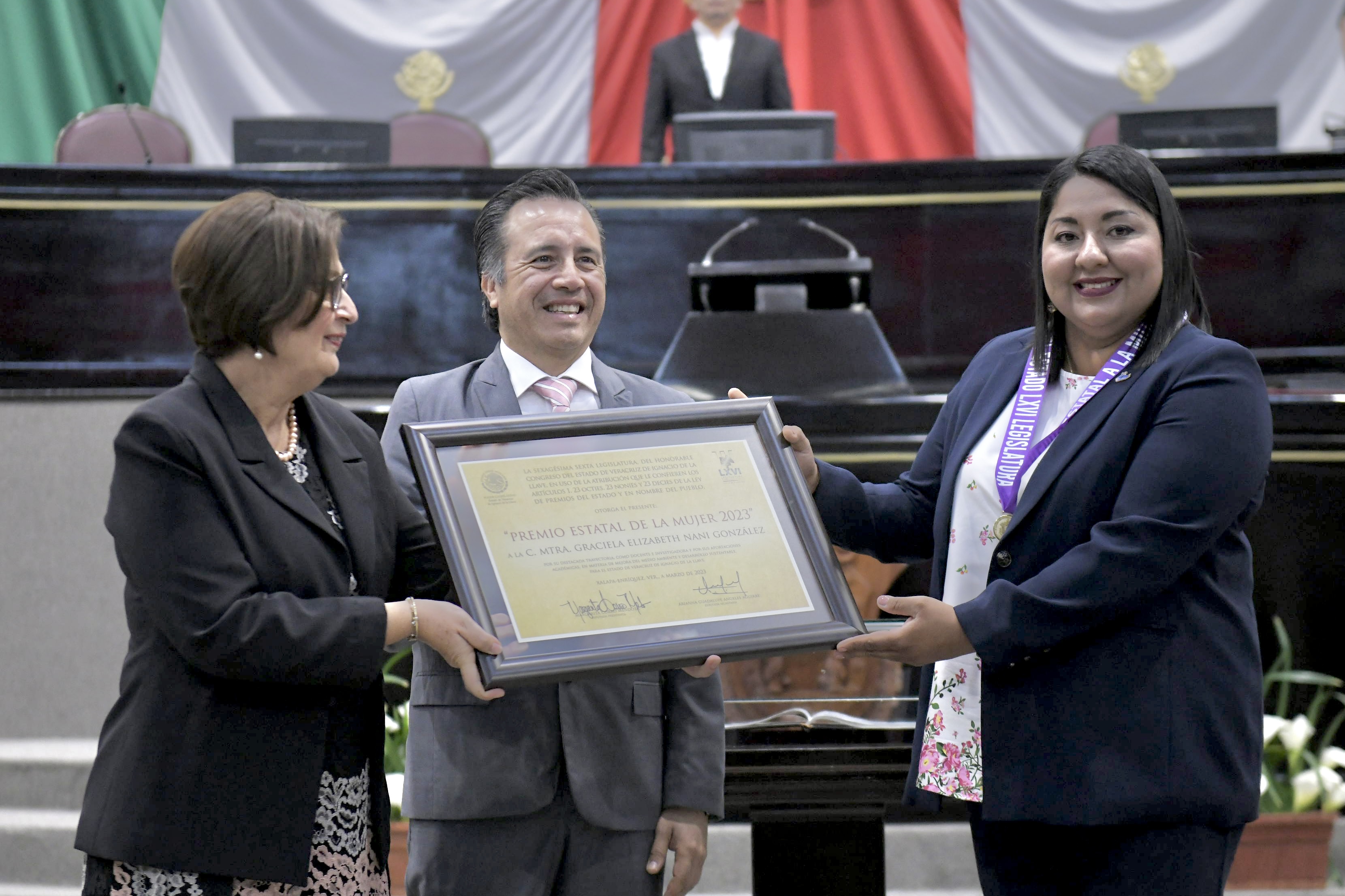 Xalapa, Ver.- Por méritos propios y no por concesiones, las mujeres veracruzanas ocupan espacios trascendentales en la toma de decisiones del Estado, de ahí que su lucha sea inspiración para nuevas generaciones, expresó el gobernador Cuitláhuac García Jiménez, durante la entrega del Premio Estatal de la Mujer Veracruzana por parte del Congreso local.