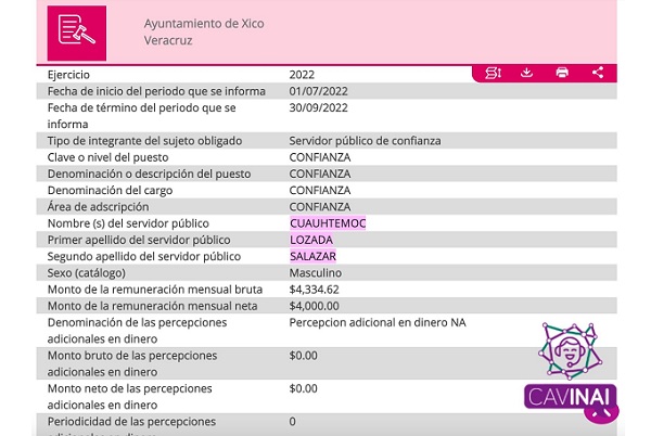 Y la misma persona cobra un salario mensual de 4 mil pesos netos con el cargo de “servidor público de confianza” dentro del Ayuntamiento de Xico.